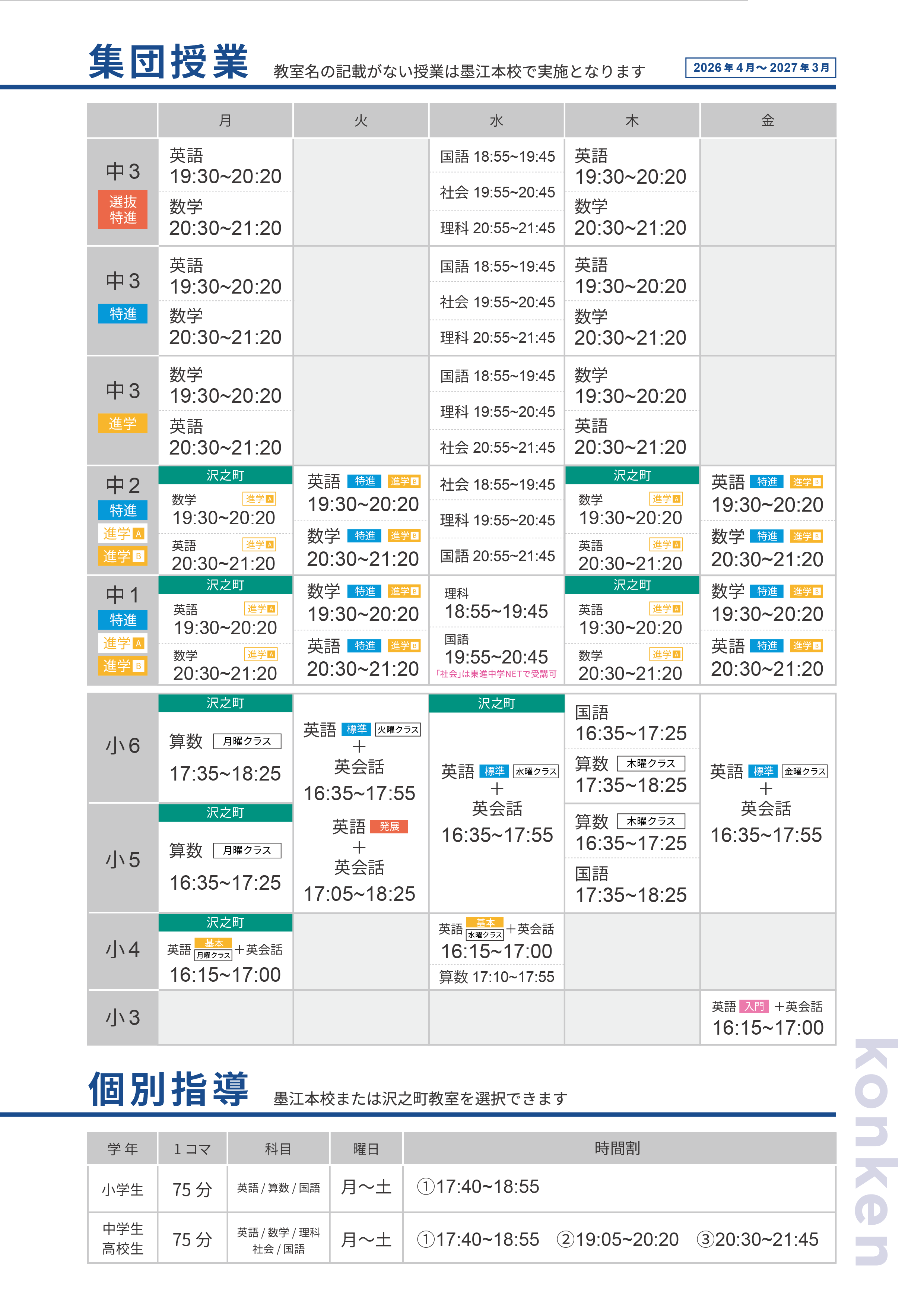 『新年度クラス(2026年4月~2027年3月)時間割』のご案内
