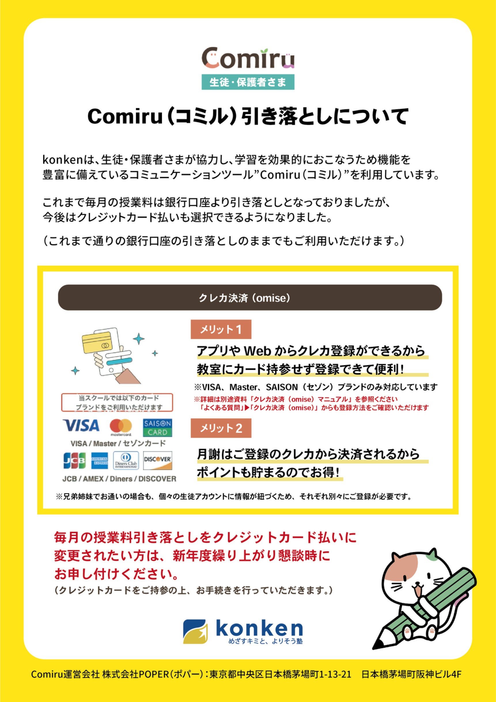 【お知らせ】毎月の授業料の引き落としにクレジットカード払いが利用できるようになりました!