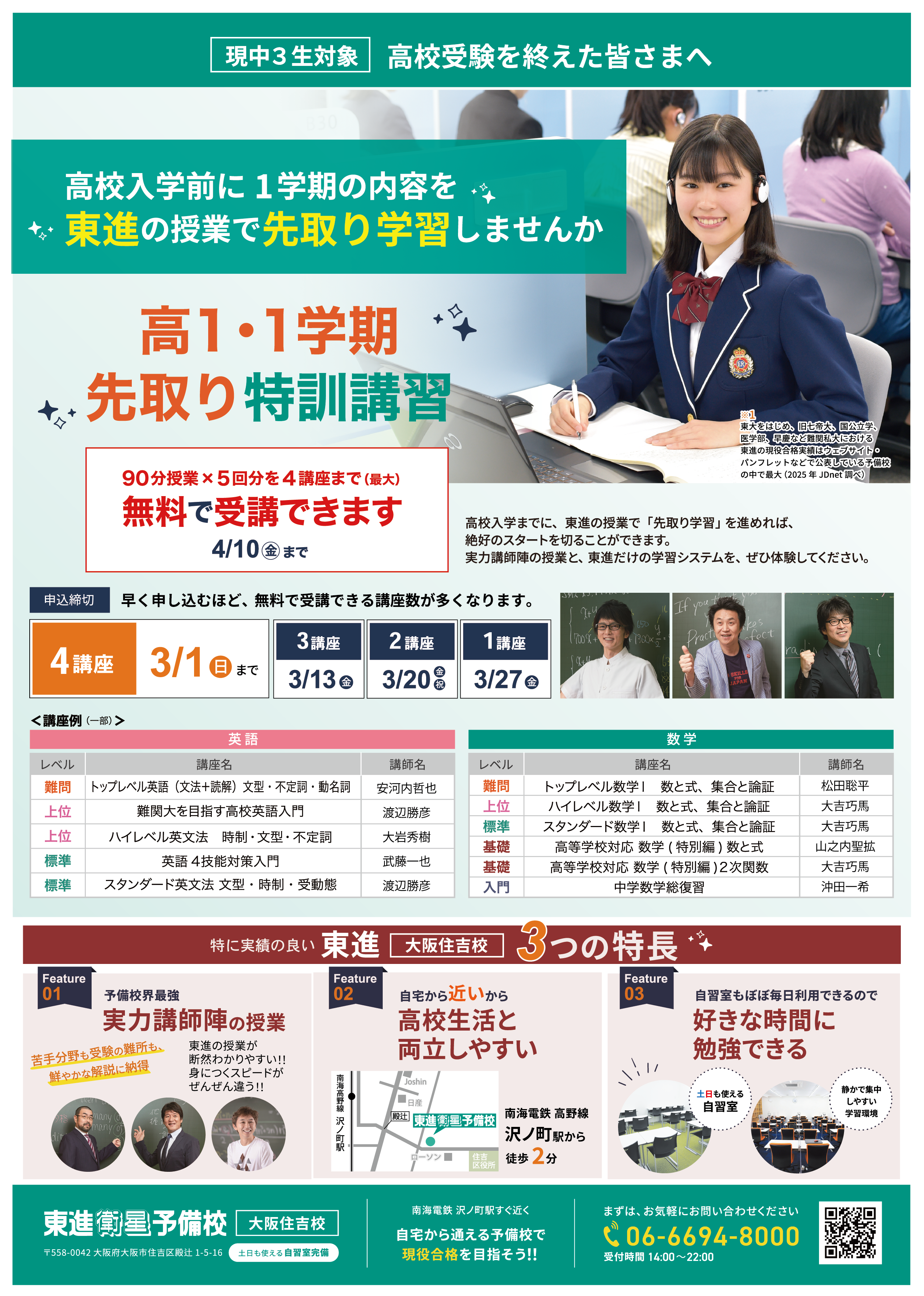 東進の高1・1学期先取り特訓講習【大阪住吉】/高校入学前に高1・1学期内容を修了|東進衛星予備校 大阪住吉校